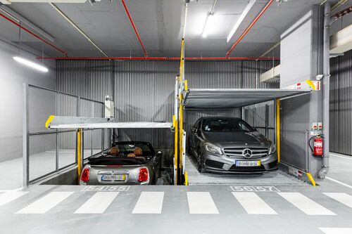 In this model, the access to the lower level is at a 14 percent slope. The slope significantly reduces the installation height compared to the Parklift 450 model. Thanks to a maximum platform load of 2,600 kg, the systems also lift heavy SUVs without any problems.