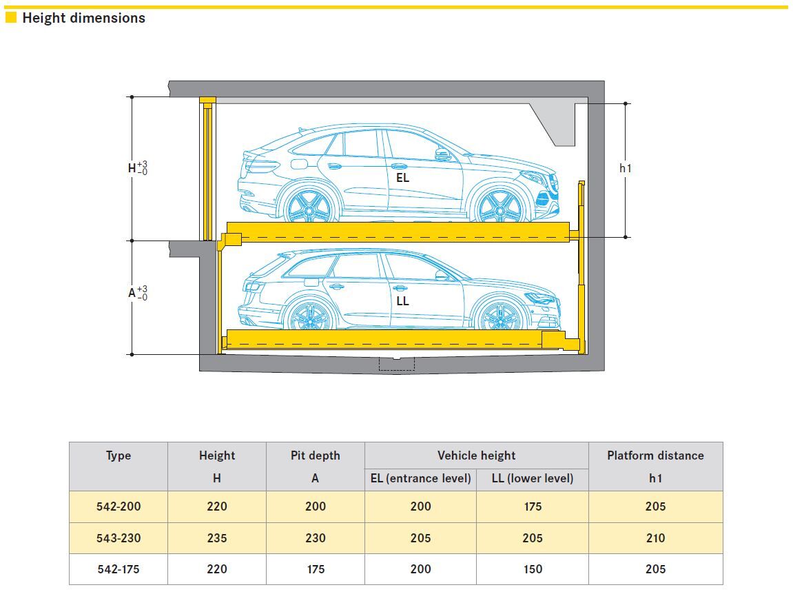 The combination of stacking and moving together with a pit arrangement provides additional height in the top level - parking space for vans, SUVs is provided.
