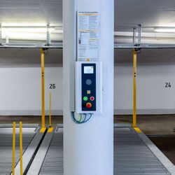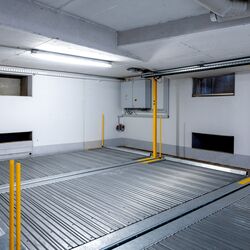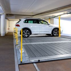 Thanks to the laterally shifting parking platforms, several rows of parking spaces can be arranged behind one another, allowing the traffic area to be reduced and making optimum use of the space available. The parking platforms move on rails and can be arranged in 2-4 parking rows directly behind each other. An empty space in each row of parking platforms allows for the selected parking space to be accessed.