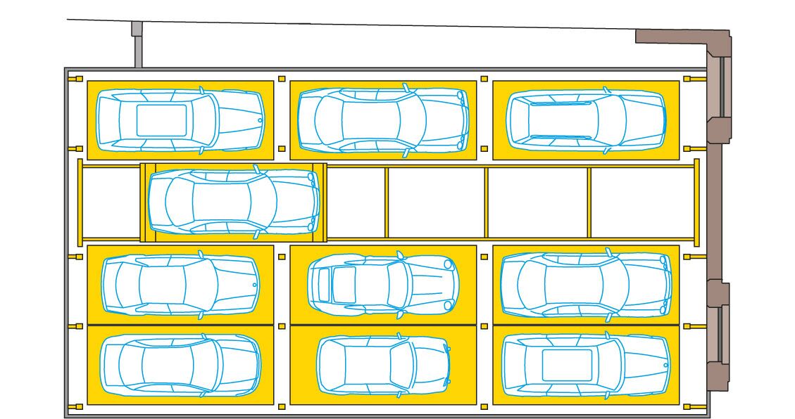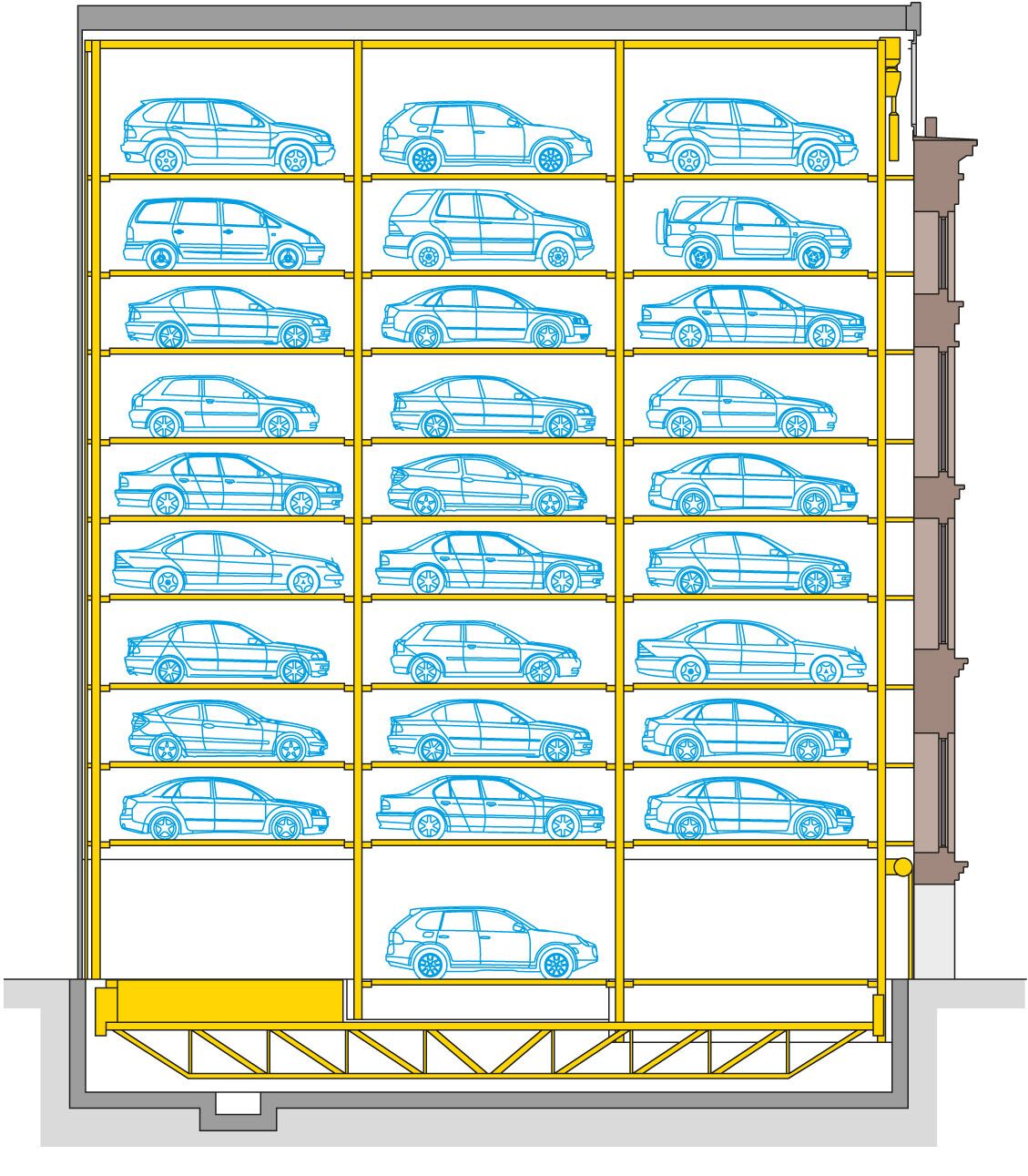 The free-standing steel parking tower braces the landmarked street-side façade, where cars exit the building. A total of 84 parking places are "hidden" behind this and used for the renovated offices and apartments in the Albany building, originally erected close to the docks in the financial district in 1858. Cars are parked automatically behind the façade. The steel structure has 10 levels, with 3 bays arranged behind each other on each level. Pallets are used to support the cars and the possibility of damage occurring is ruled out entirely. An impressive number of parking places were created between the buildings in a niche approximately 10 meters wide and 18 meters long. The animation shows how the system works.