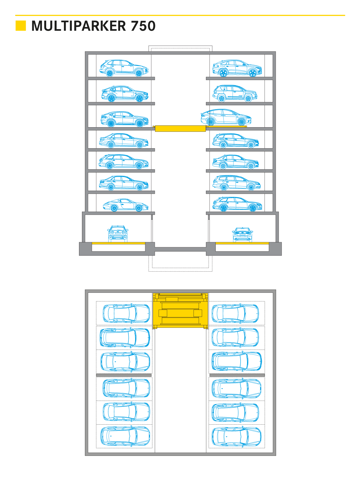Multiparker 750 oferuje więcej miejsc parkingowych na maksymalnie 30 poziomach parkingowych, w betonowej konstrukcji stropów, bez palet.