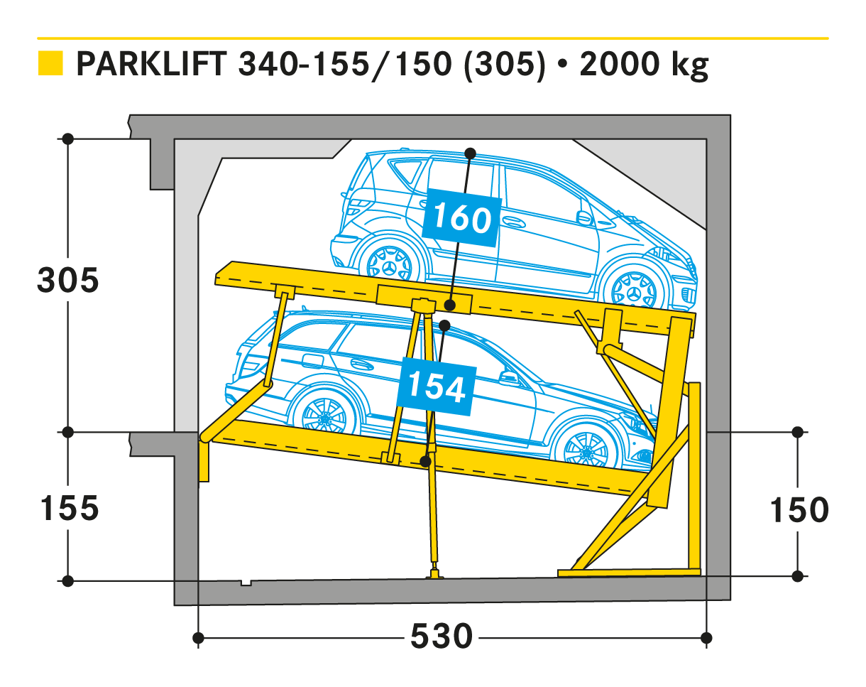 System Parklift 340 z pochyłymi platformami (górną i dolną), nachylenie platformy wynosi 5 ° / 9%, co umożliwia bezpieczny wjazd na platformy samochodami o niewielkim prześwicie. Pojedyncza jednostka dla 2 samochodów, podwójna jednostka dla 4 samochodów.
