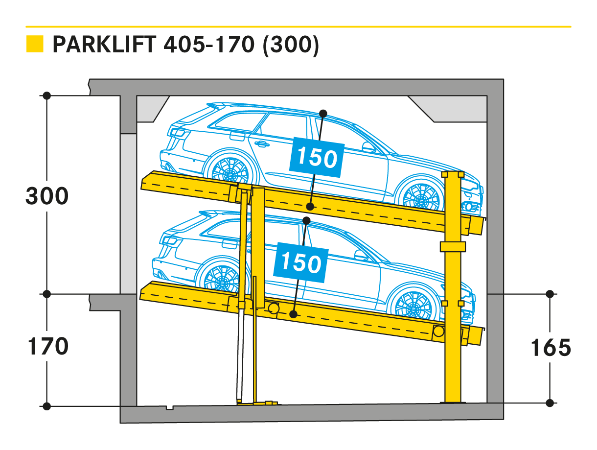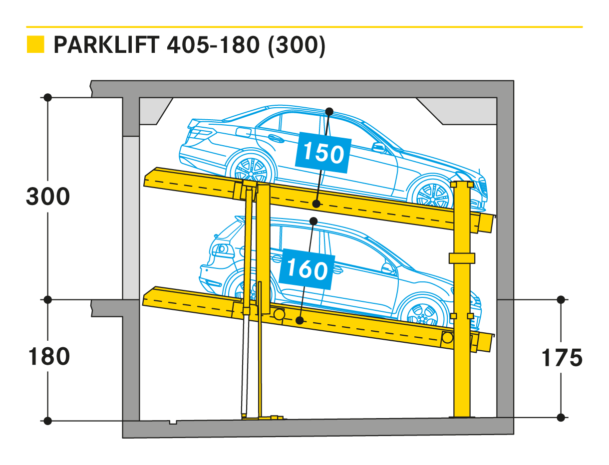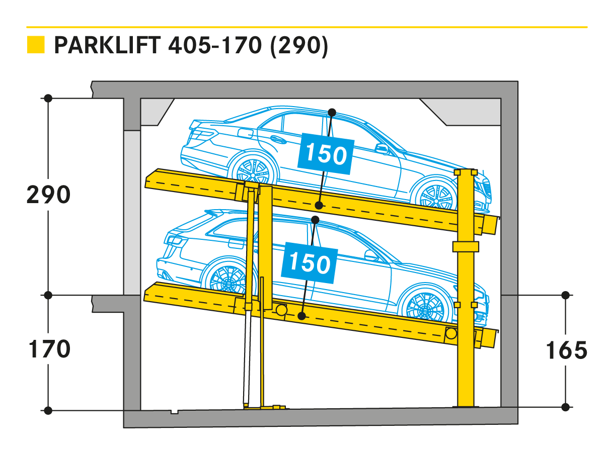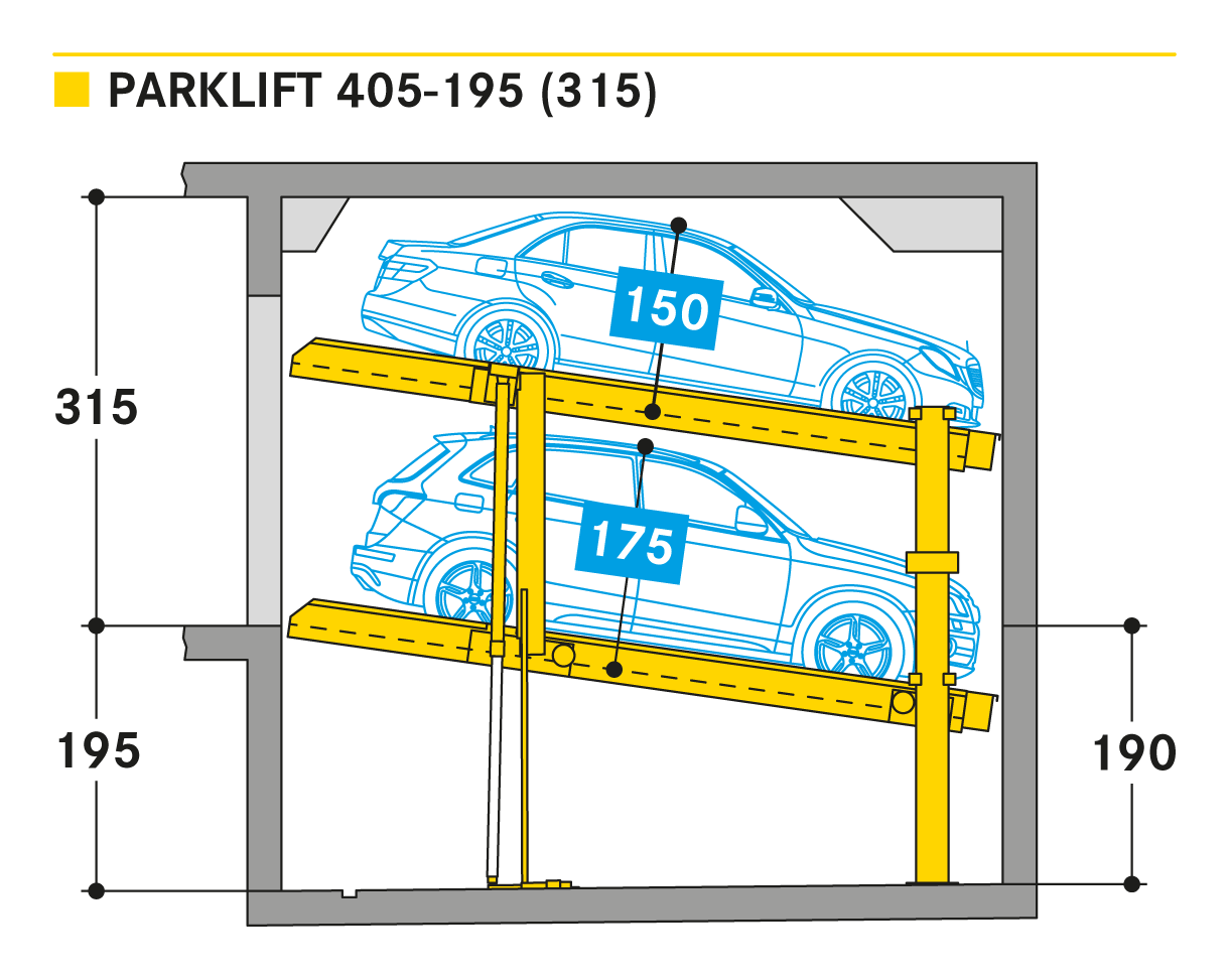 Parklift 405 jest oferowany z takimi samymi rozwiązaniami jak Parklift 450, a dodatkowo ma jeszcze jedną zaletę: przy jeszcze niższej wysokości sufitu można zaparkować takie same wymiary pojazdu jak w Parklift 450. Dolna platforma parkingowa jest pochylona. W odpowiedzi na rosnące wymiary pojazdu i zmniejszające się wymiary dostepnej przestrzeni garażowej - dolna platforma jest pochylona z nachyleniem 14%. Górna platforma ma minimalne nachylenie 2%, co służy do odwodnienia górnego miejsca parkingowego. Pojedyncze urządzenie przeznaczone jest dla 2 samochodów, urządzenie podwójne dla 4 samochodów.