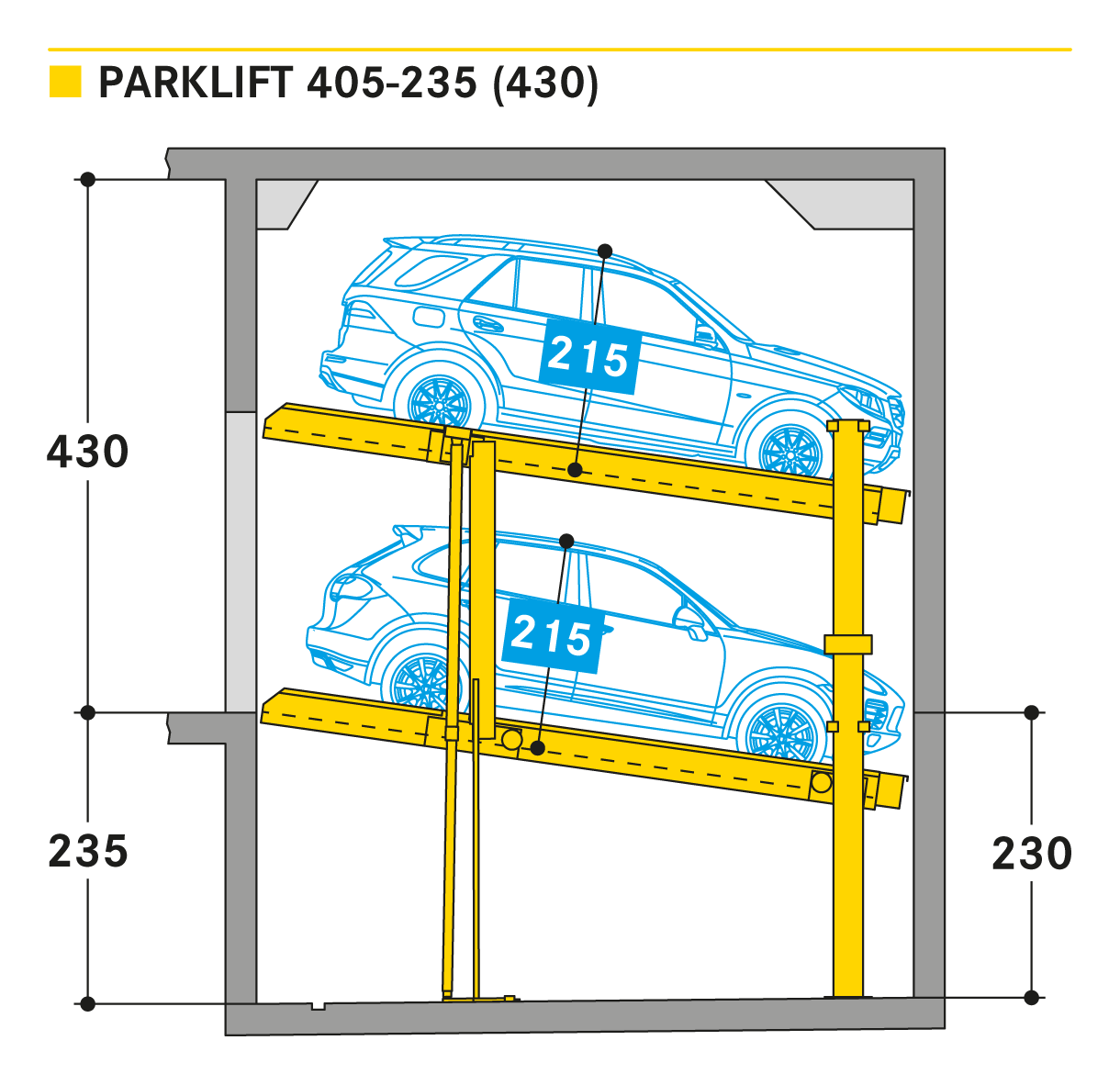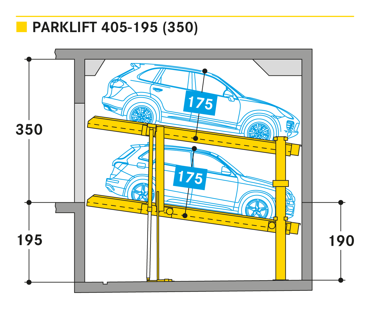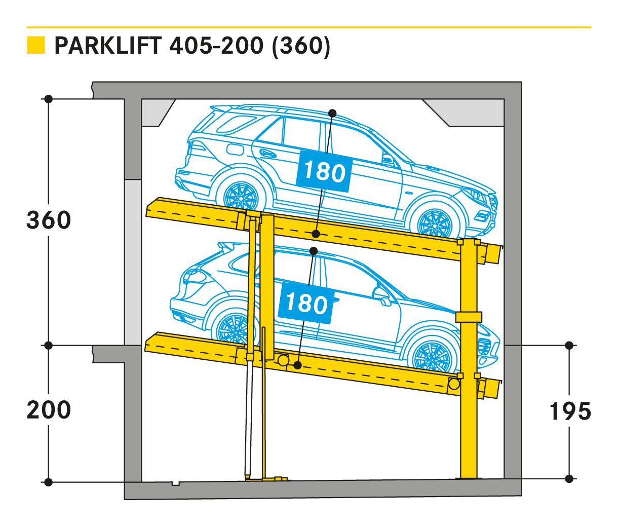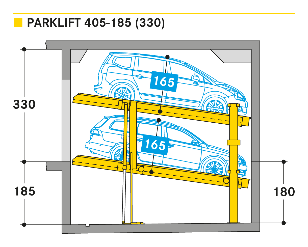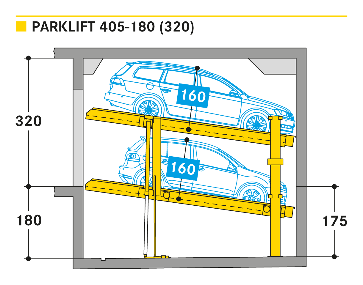 Parklift 405 jest oferowany z takimi samymi rozwiązaniami jak Parklift 450, a dodatkowo ma jeszcze jedną zaletę: przy jeszcze niższej wysokości sufitu można zaparkować takie same wymiary pojazdu jak w Parklift 450. Dolna platforma parkingowa jest pochylona. W odpowiedzi na rosnące wymiary pojazdu i zmniejszające się wymiary dostepnej przestrzeni garażowej - dolna platforma jest pochylona z nachyleniem 14%. Górna platforma ma minimalne nachylenie 2%, co służy do odwodnienia górnego miejsca parkingowego. Pojedyncze urządzenie przeznaczone jest dla 2 samochodów, urządzenie podwójne dla 4 samochodów.