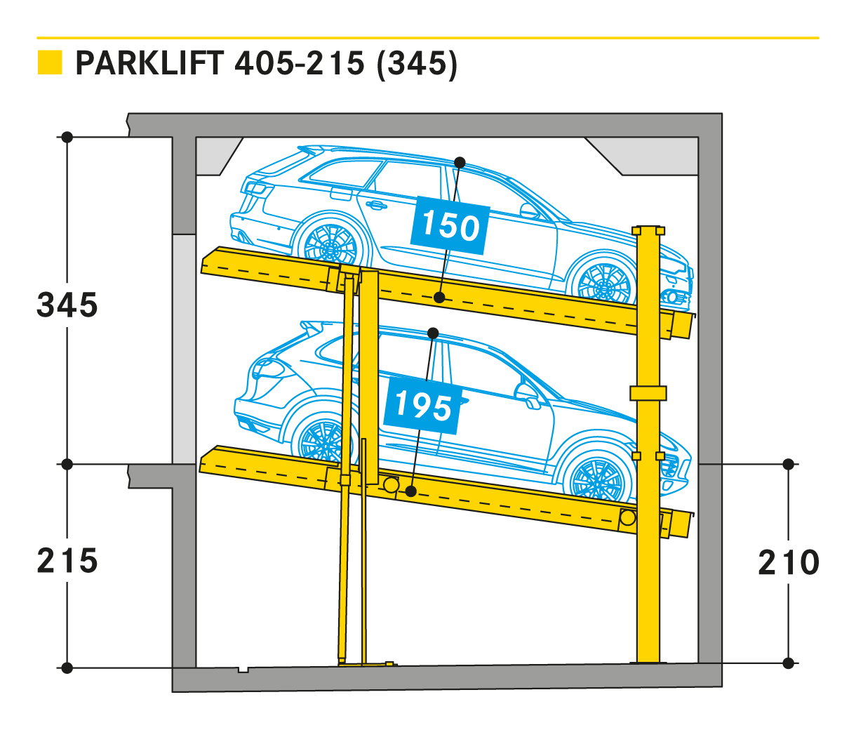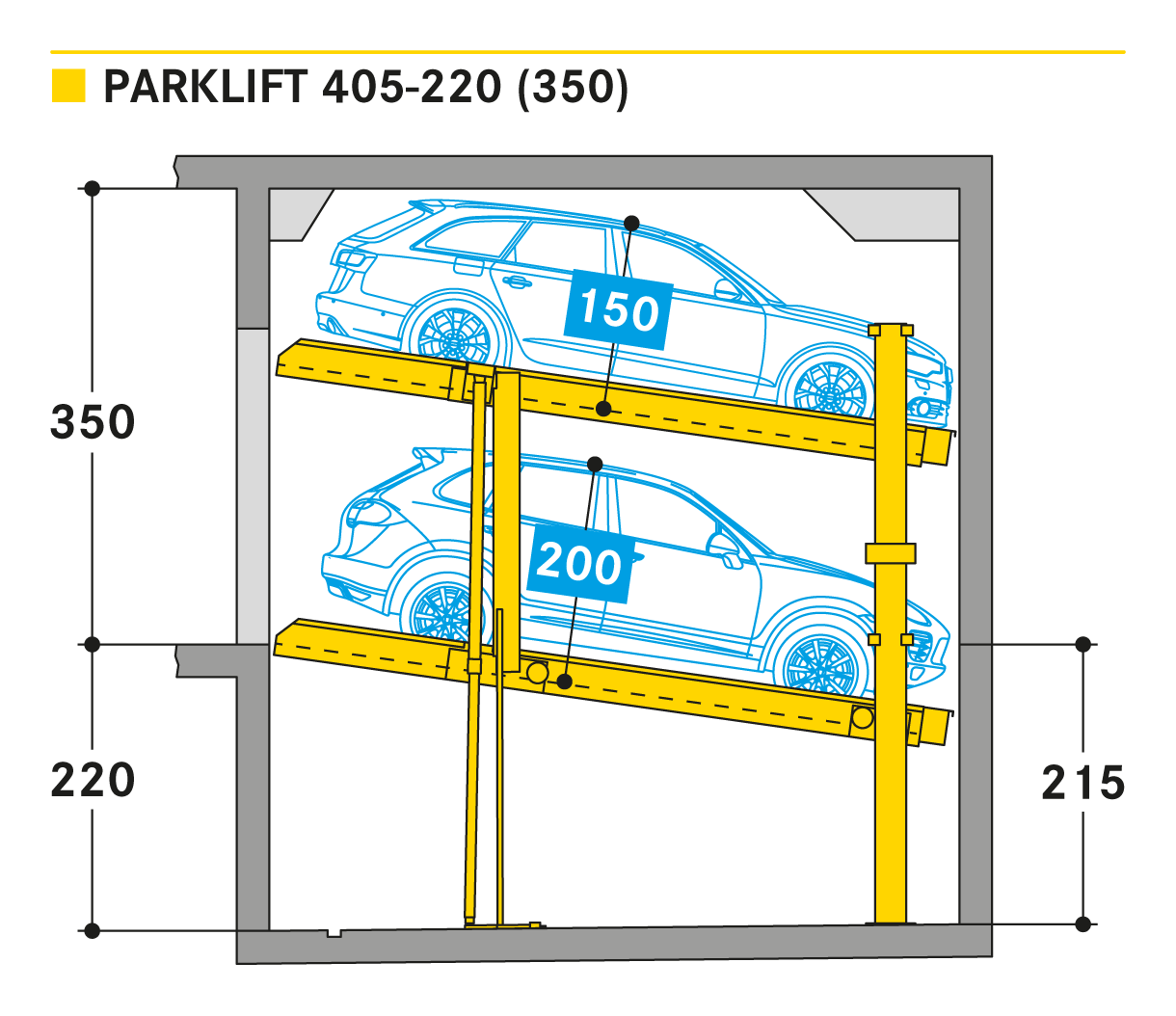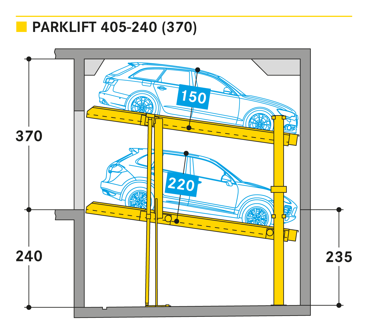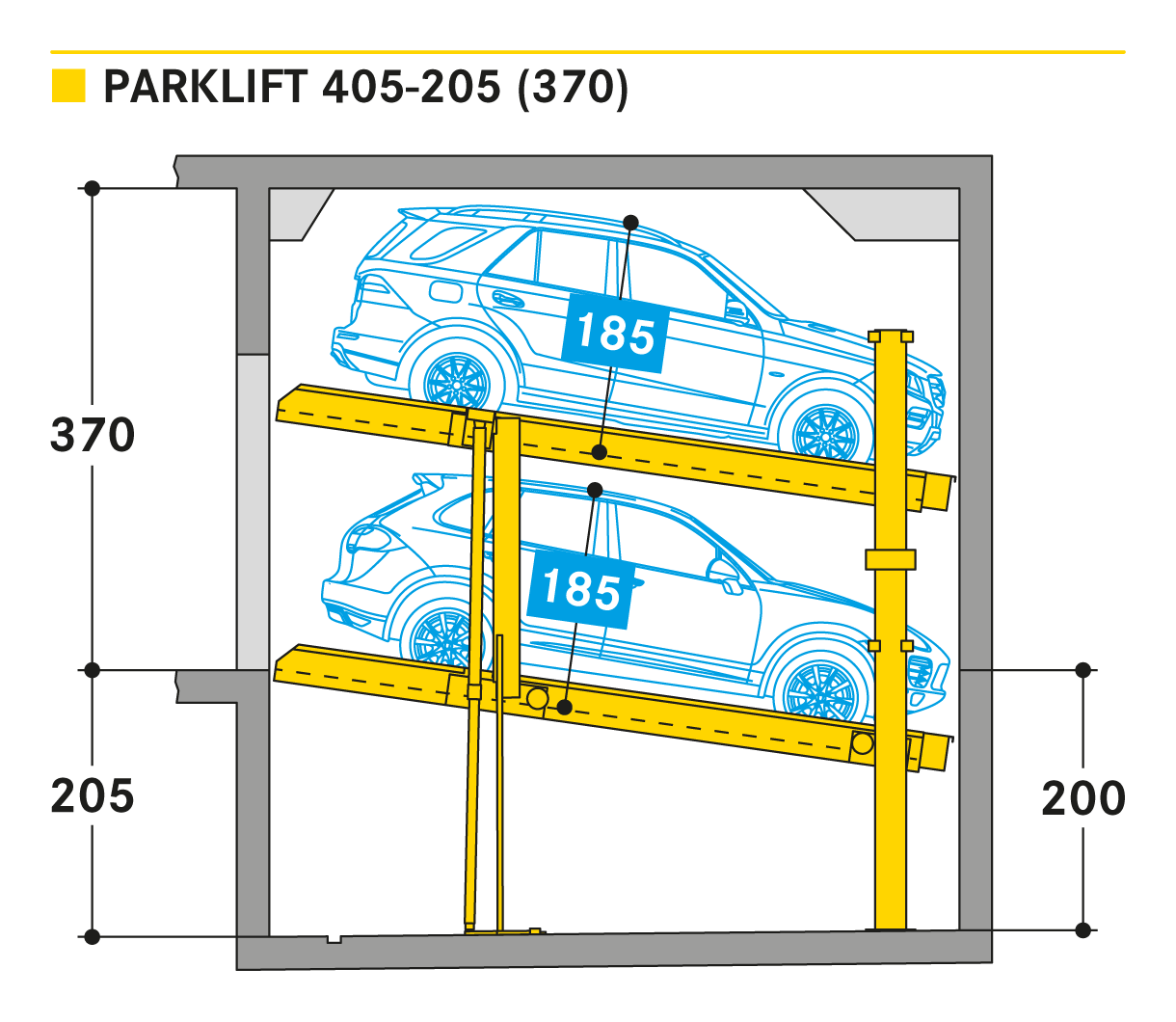 Parklift 405 jest oferowany z takimi samymi rozwiązaniami jak Parklift 450, a dodatkowo ma jeszcze jedną zaletę: przy jeszcze niższej wysokości sufitu można zaparkować takie same wymiary pojazdu jak w Parklift 450. Dolna platforma parkingowa jest pochylona. W odpowiedzi na rosnące wymiary pojazdu i zmniejszające się wymiary dostepnej przestrzeni garażowej - dolna platforma jest pochylona z nachyleniem 14%. Górna platforma ma minimalne nachylenie 2%, co służy do odwodnienia górnego miejsca parkingowego. Pojedyncze urządzenie przeznaczone jest dla 2 samochodów, urządzenie podwójne dla 4 samochodów.