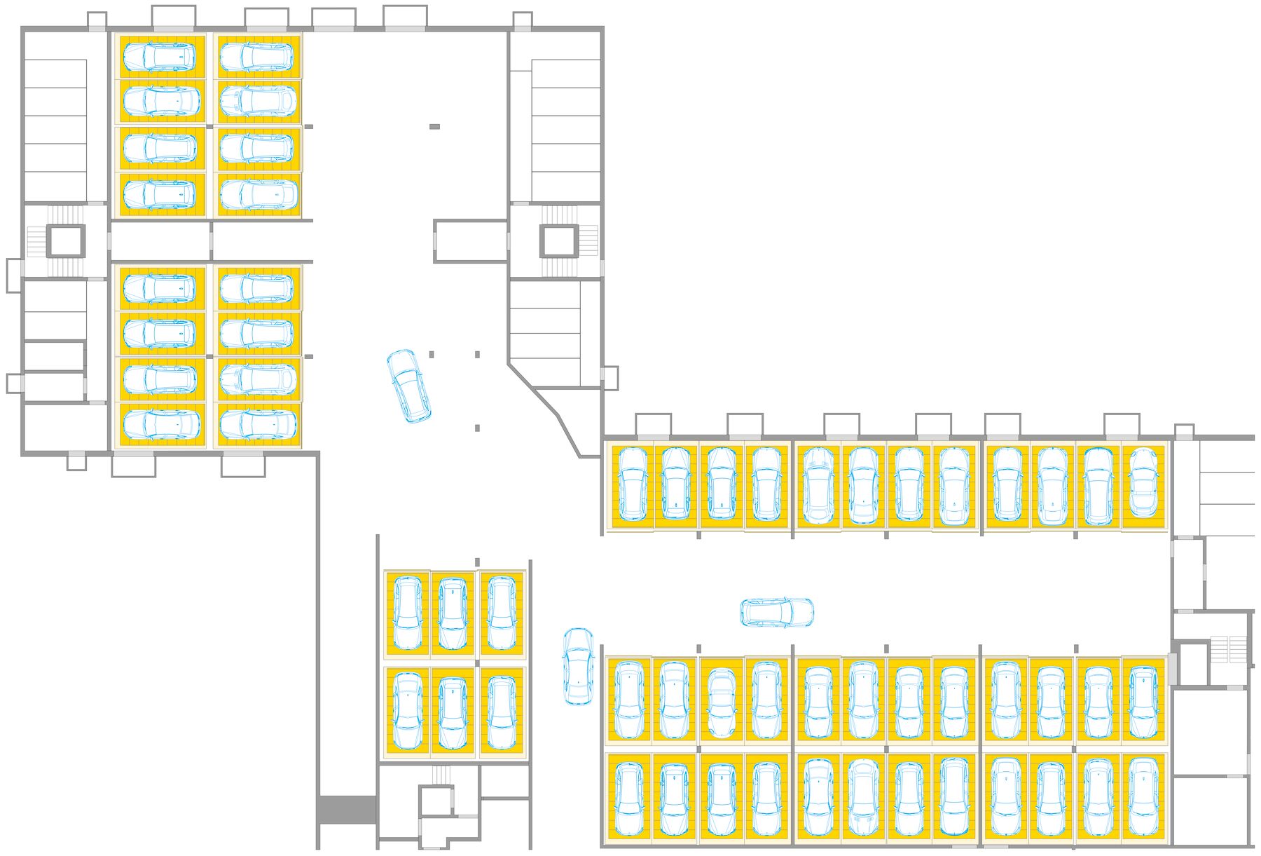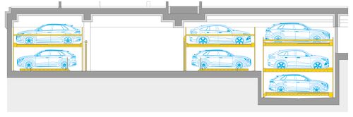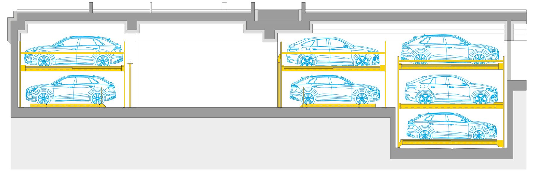 Of the total of 171 car parking spaces in the neighbourhood, 124 are accommodated in the space-saving WÖHR Combilift systems, variants 543 and 552. Spread across 15 systems with different grid sizes, they offer residents convenient and efficient parking spaces – optimally adapted to the structural conditions and needs of the neighbourhood.