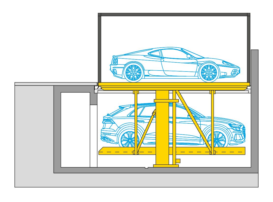 Aby wychodzenie z pojazdu było jeszcze wygodniejsze, na życzenie klienta zwiększono szerokość platformy Parklit ze standardowych 500 cm do 540 cm. Mechaniczny system parkowania Parklift 461-2.6 D jest niezwykle łatwy w użyciu: każdy system Parklift ma dwa horyzontalnie dostępne miejsca na dwóch poziomach. Niższy poziom horyzontalny można całkowicie opuścić, a górny poziom przylega do podłoża i jest pokryty jasnymi płytami z piaskowca, podobnie jak reszta dziedzińca. Zapewnia do elegancki i harmonijny wygląd, podkreślając i gwarantując optymalną ochronę dla wartościowych pojazdów właściciela.