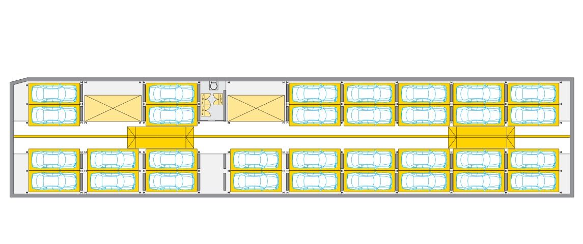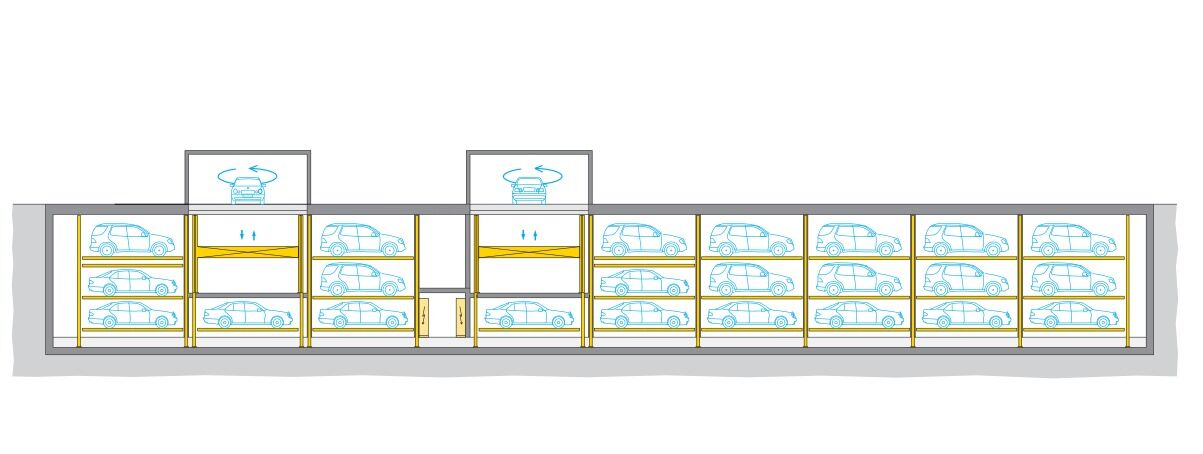 Pierwszorzędna rezydencja obejmuje również wygodne miejsca parkingowe do bezpiecznego i szybkiego parkowania pojazdów. Architekci wybrali automatyczny system parkowania WÖHR Multiparker 740. Dwa pomieszczenia wjazdowe i wyjazdowe obsługują 98 podziemnych miejsc parkingowych.