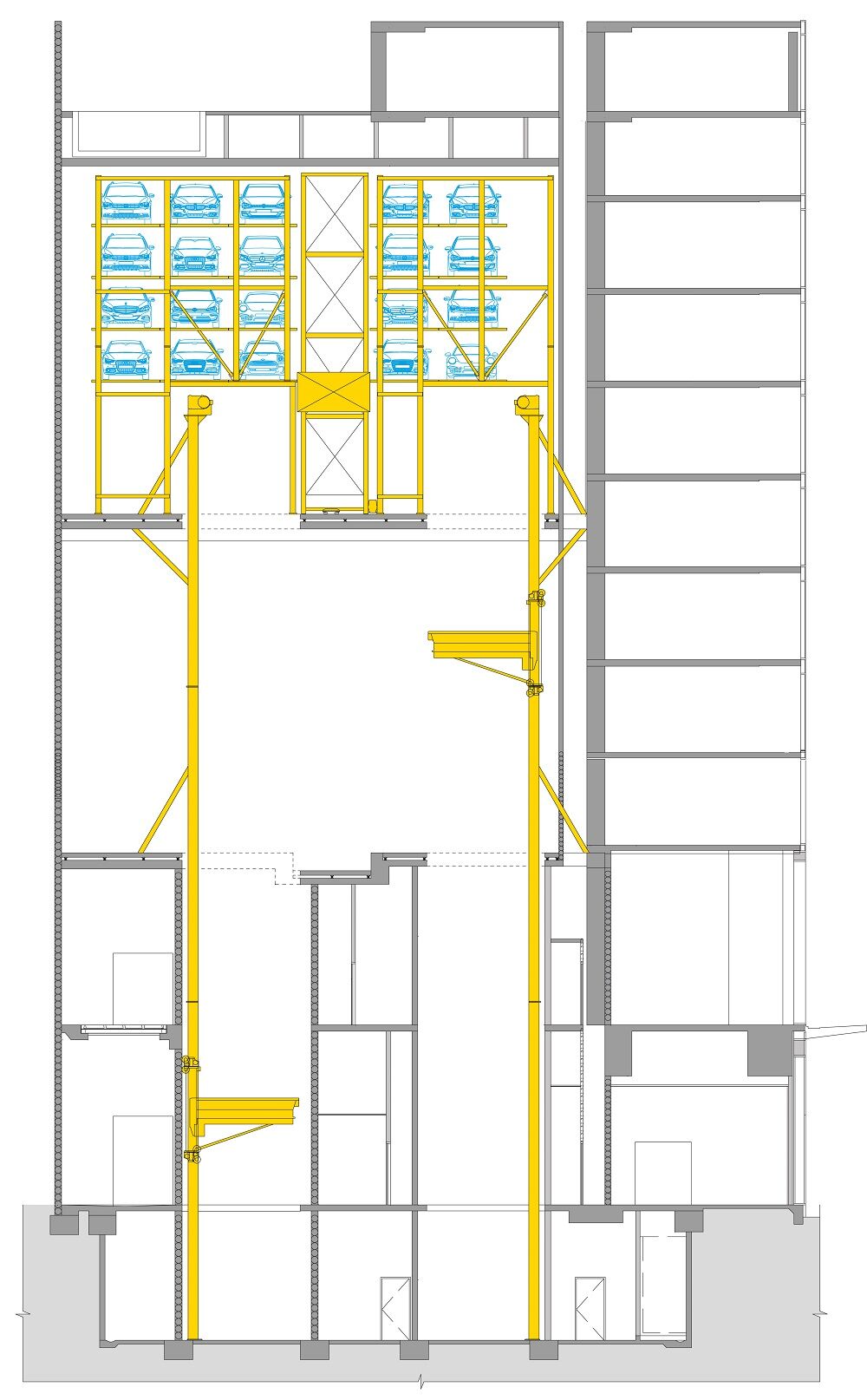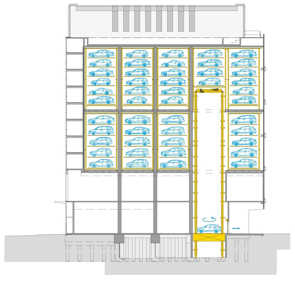 Garaż w „Skytower”: nasz system parkowania, który jest w stanie wykonać 30 - 47 cykli parkowania na godzinę, z dwoma kabinami wjazdowo-wyjazdowymi. Multiparker 740 układa samochody o wysokości od 160 do 200 cm na 11 poziomach regału garażowego. Całkowita wysokość obiektu w części garażowej wynosi ok. 25 mi zaczyna się od ok. 12 m nad poziomem wjazdu do budynku. Procedury parkowania są obsługiwane za pomocą chipa RFID na panelu sterowania, który znajduje się w pobliżu obszaru transferu.