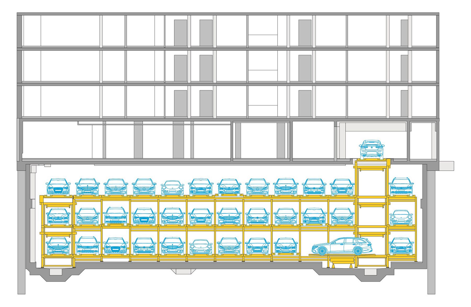 Fully automatic parking system for 36 vehicles: The residents of the new building in Danklstraße, Munich park in the Levelparker 590 system.