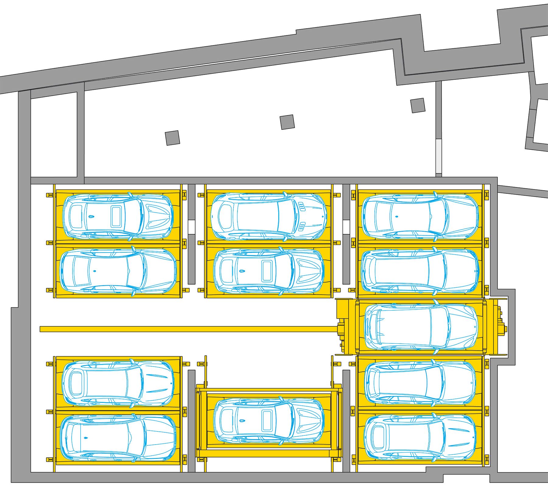 The Franklinturm also fulfils important public space functions. In addition to the ramp to the public bicycle garage, deliveries to and from the station's ShopVille also take place on the ground floor of the tower. The adjacent ‘WÖHR Multiparker 740’ parking system efficiently integrates 38 car parking spaces for the tenants in the building. Once the vehicles have been parked in the transfer cabin, they are automatically removed within approx. 139 to 222 seconds and parked in the four-storey high-bay warehouse in the basement. Depending on the vehicle height, 21 parking spaces up to max. 2.00 m and 17 parking spaces up to 1.70 m are available for vehicle weights up to max. 3.00 tonnes. The 360° swivelling device in the transfer cabin enables convenient parking and unparking in the direction of travel.